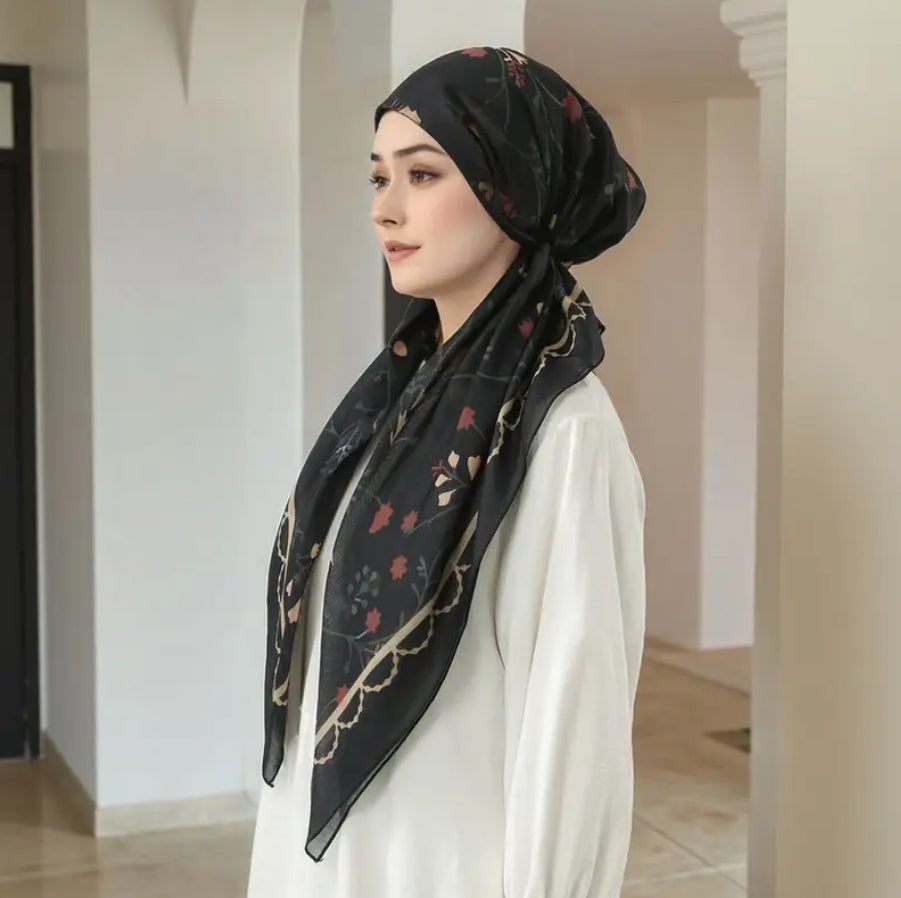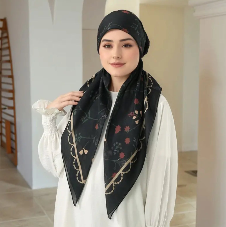 Maryam’s Essential Mature Elegant Vintage Print Pre-Tied Elastic Band Hijab Featuring a unique blend of high-quality fabrics, this hijab offers a comfortable fit that is perfect for everyday wear.