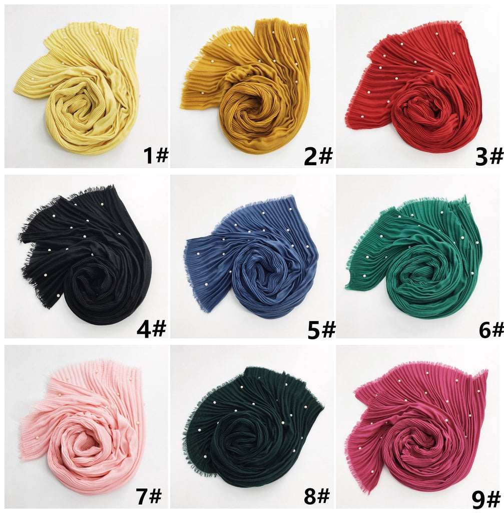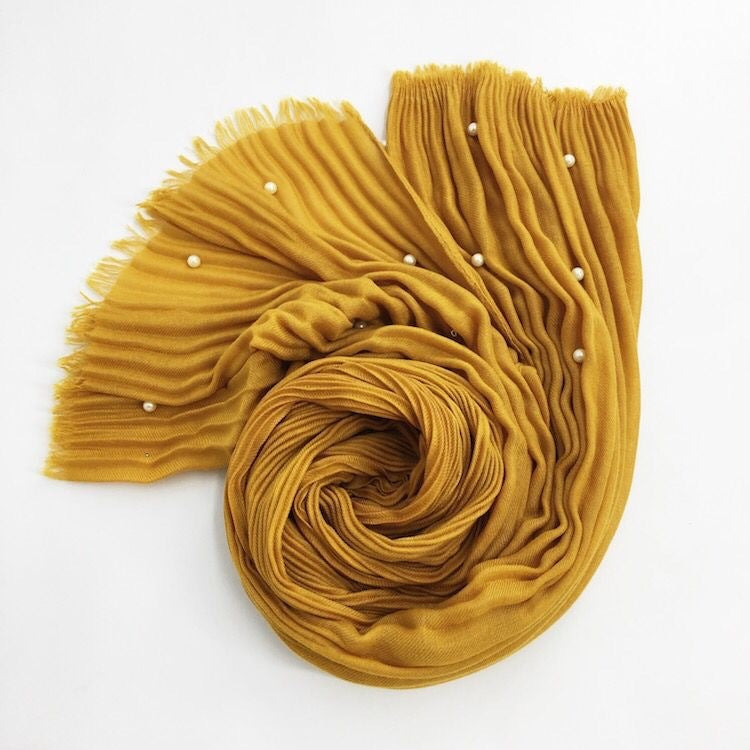 Keep away from the standard ways of wrapping your scarf/shawl, and realise how trendy you can be when you explore with Maryam's Diamond Style Latest Cotton Viscose Pleated Crinkle with Pearls Hijab.