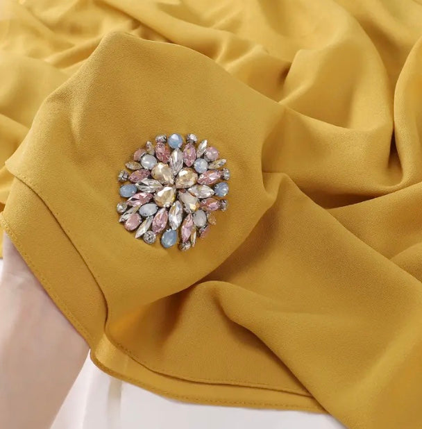 Maryam's Diamond Style Pure Colour Luxury Chiffon Hijab/Shawl are made with the finest quality fabric and design. An exceptional luxuriant hijab steeped lavishly with diamond shaped crystals that are skillfully crafted into flower embelishment and are secured individually provides definition and richness, also giving it a timeless piece made for formal occasions adding both charm and grace.