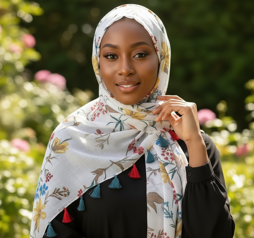 Maryam's Essential Flower Printed Cotton Viscose Tassels Hijab collection are produced from cotton material which makes them extremely strong, durable resistant to shrinking and wrinkle, a very soft feel, simple to style due to its construction.